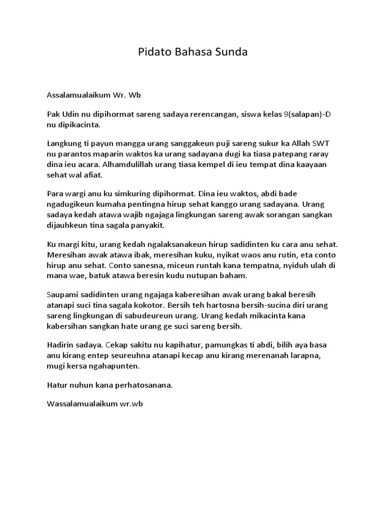 Pidato Bahasa Sunda As Asshaduallailahaillalah Waashaduanna. Kebersihan lingkungan sendiri masih menjadi tugas besar bagi kita semua. Pidato Bahasa Sunda Tentang Kebersihandocx Contoh lomba pidato bahasa sunda lingkungan hidup contoh soal sing a song.